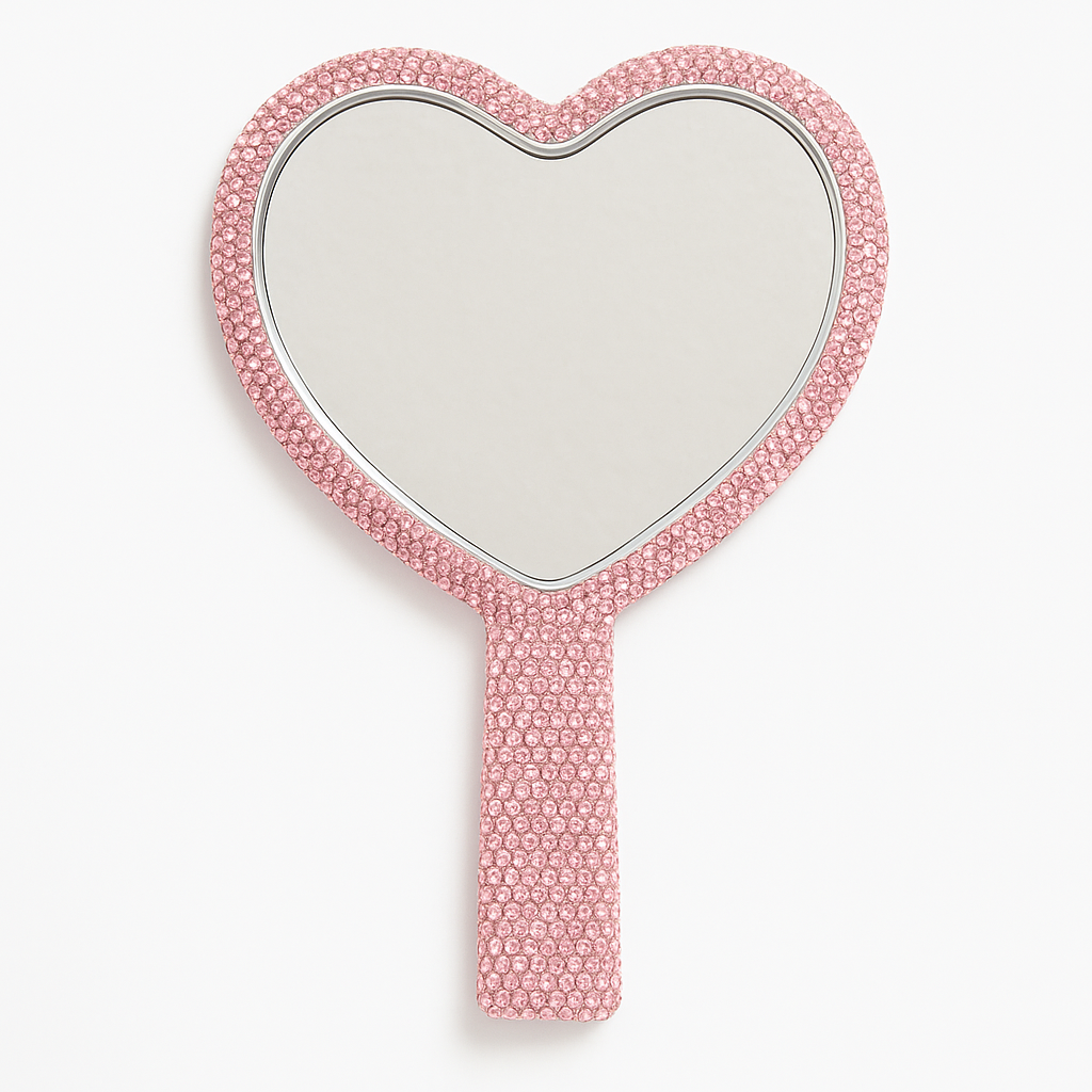 Each mirror features a smooth, clear reflection framed in sparkling rhinestones — perfect for lash reveals, makeup application, or retail displays. Available in multiple shapes and colors to complement your aesthetic and workspace.