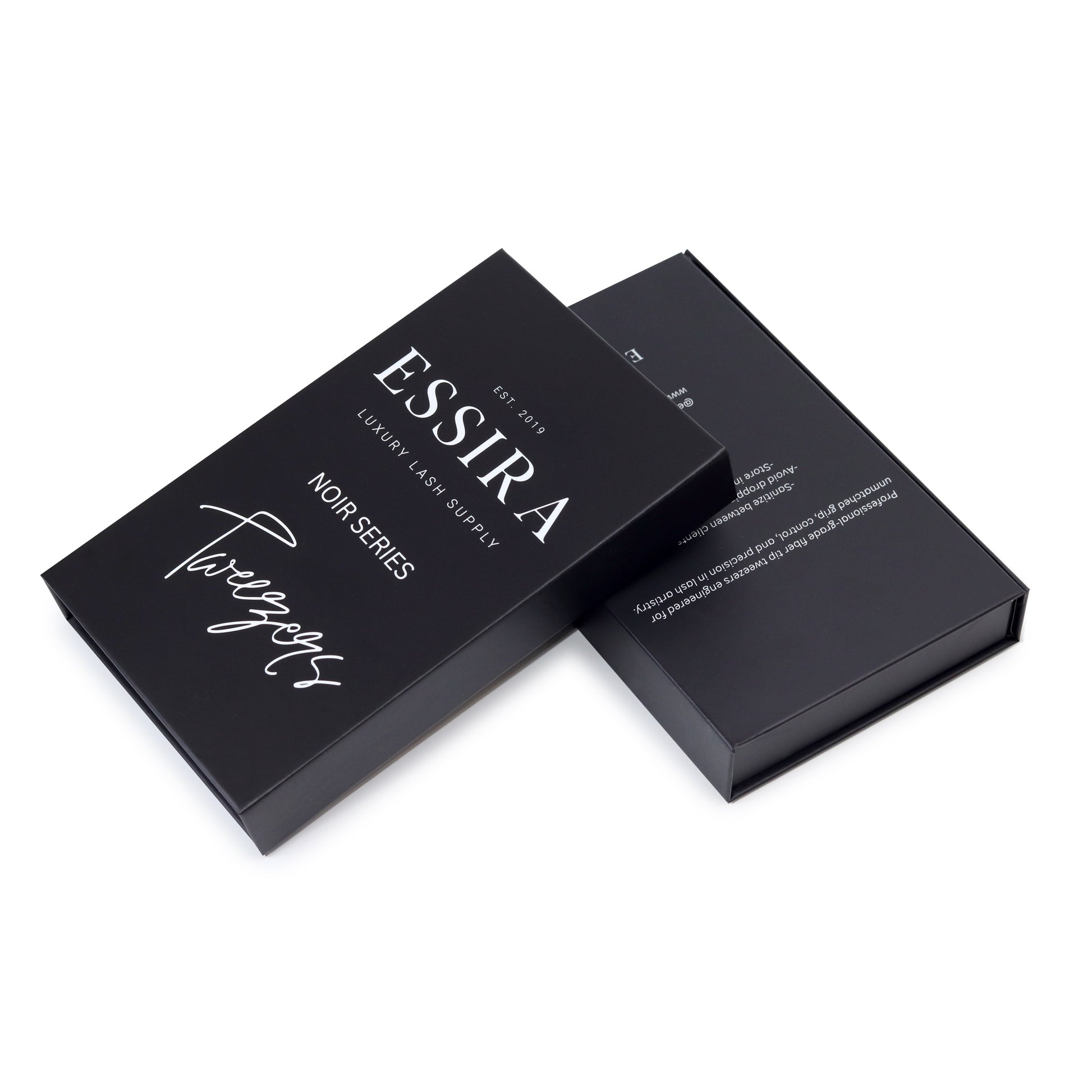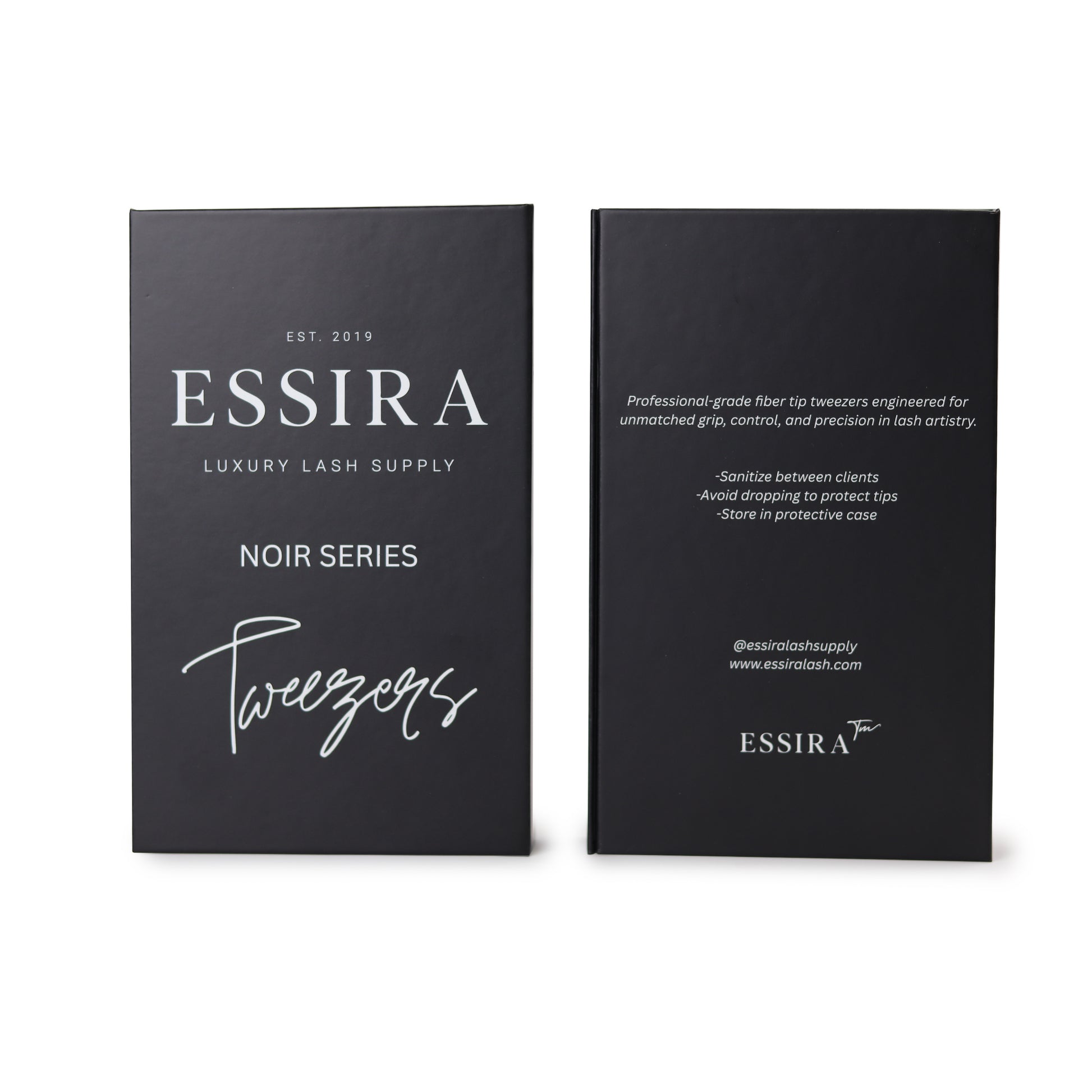 The Essira Noir Series 5-Piece Set includes every essential tweezer you need for classic, hybrid, volume, and mega volume artistry. Each fiber-tip tweezer is hand-tested for precision and packaged in the premium Essira Noir magnetic box — a perfect upgrade for your lash cart or a high-end retail gift for lash techs.